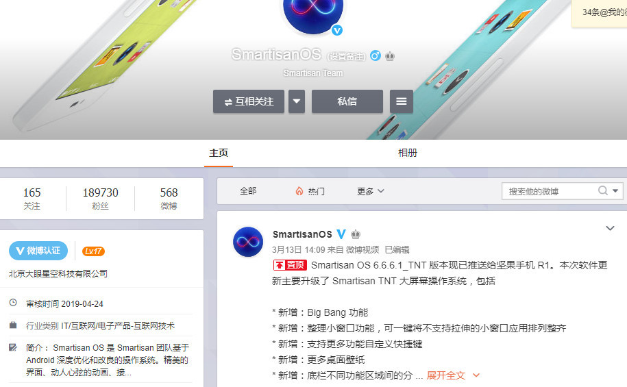 日前,有网友发现名为@坚果OS 的账号现身微博,其认证信息为锤子科技(北京)有限公司。