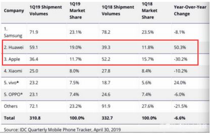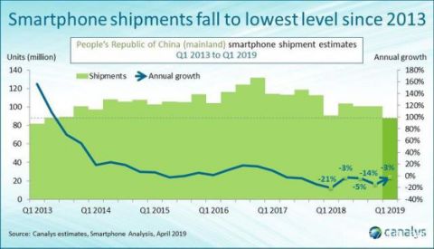 另外,根据报告,2019年一季度,中国智能手机市场同比萎缩 3%,总出货量具体为 8800 万部,为六年来最差的市场表现。